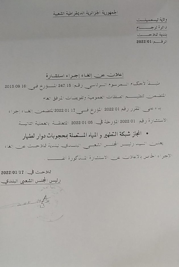 إعلان عن إلغاء إجراء استشارة رقم 2022/01