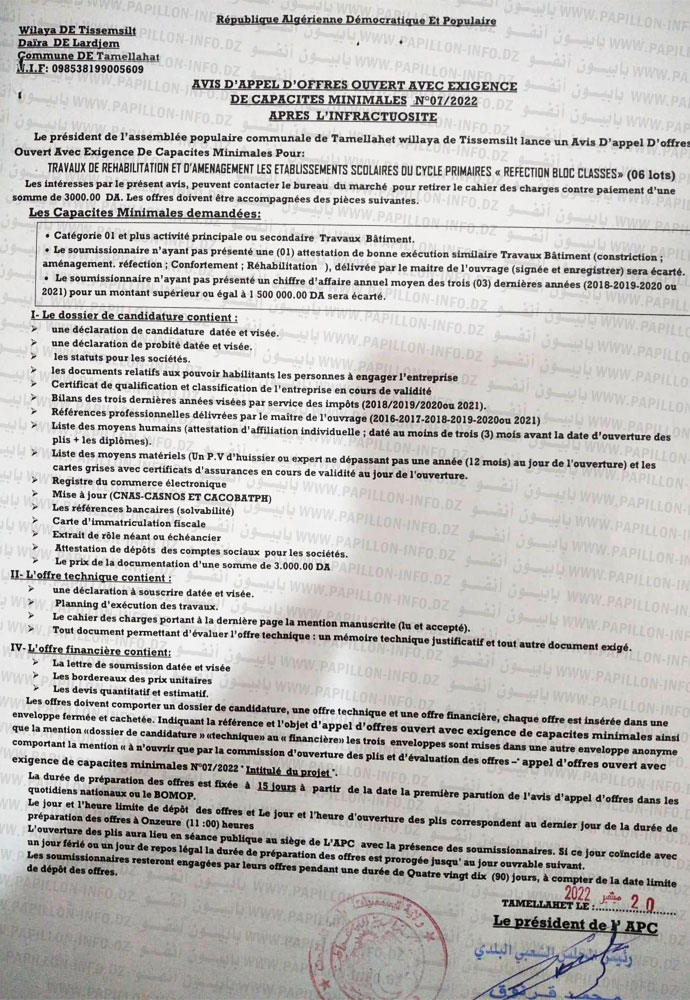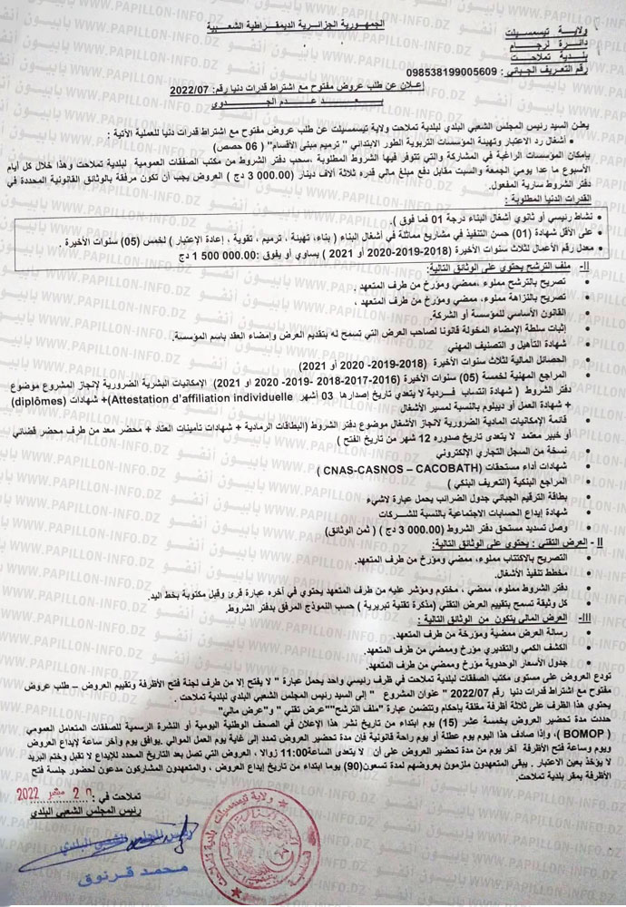 إعلان عن طلب عروض مفتوح مع اشتراط قدرات دنيا رقم 2022/07 بعد عدم الجدوى